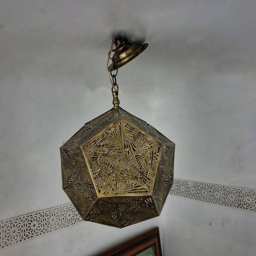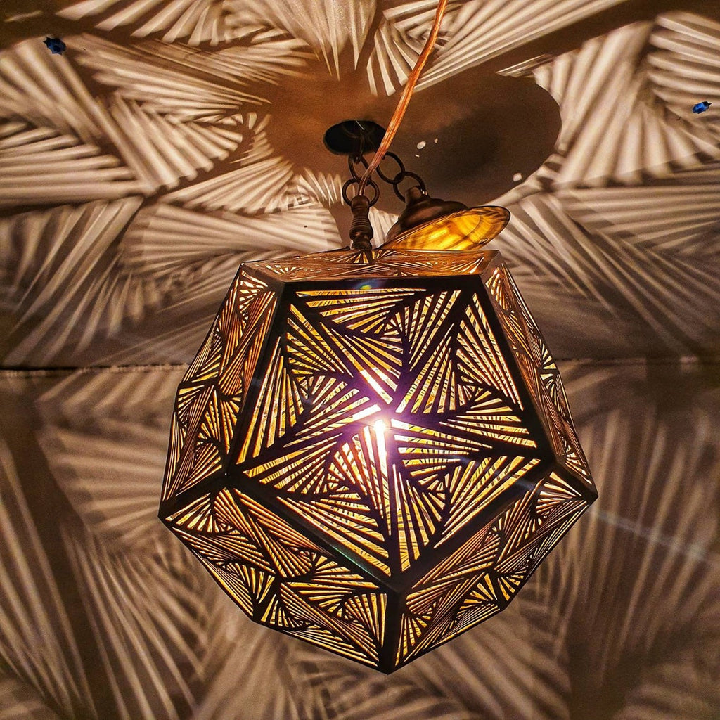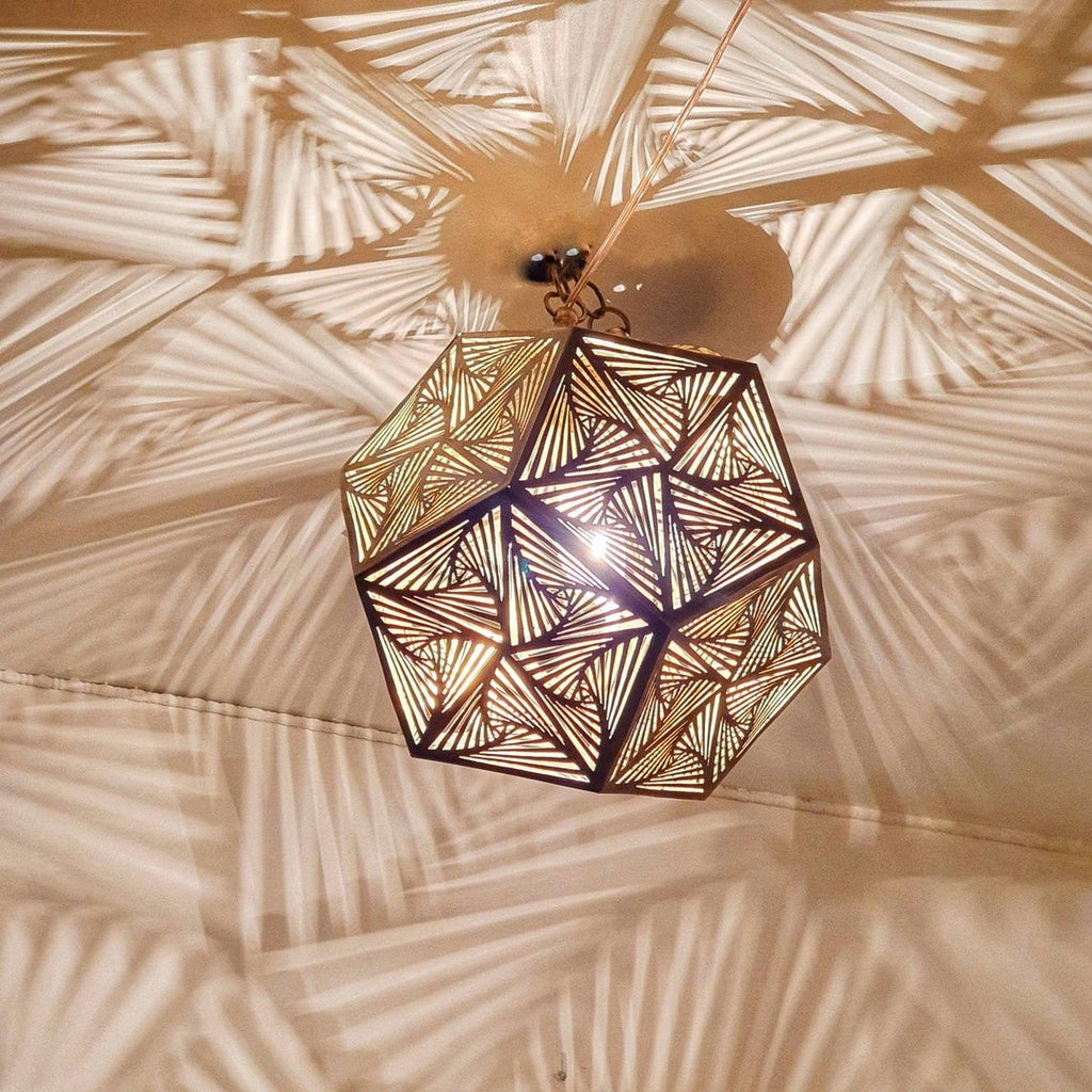 A suspension in the form of a polyhedron between 33 cm/ 13 in and 43 cm/ 17 in Height / Width , which will add a touch of craftsmanship to your interior by diffusing the most captivating patterns through the walls and ceilings, and illuminating the room.