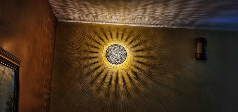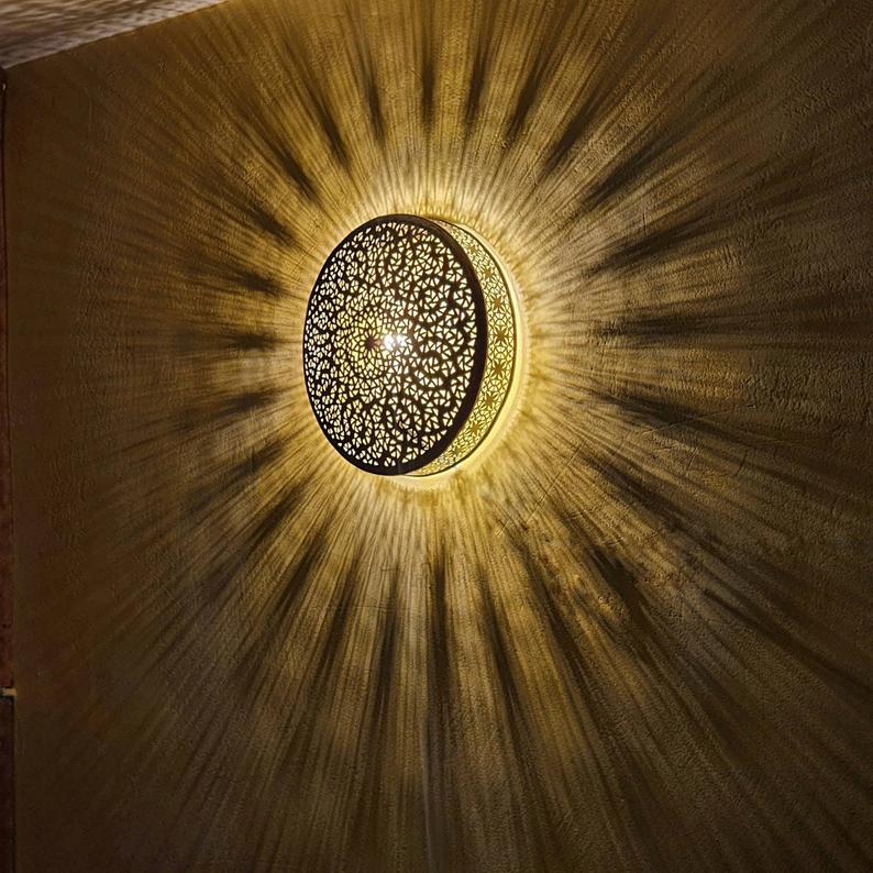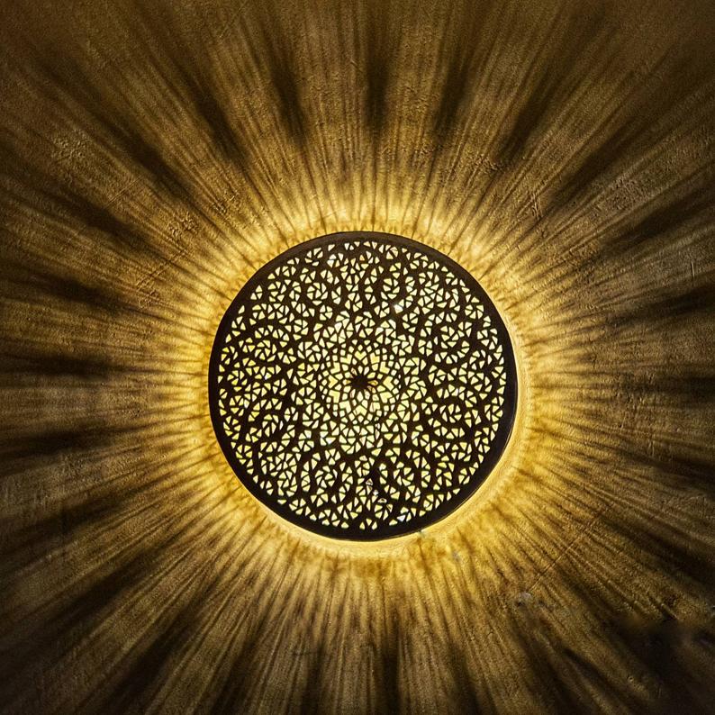 A wall sconce in the form of a SUN between 30 cm/11.8 in and 50 cm/19.7 in diameter, which will add a touch of craftsmanship to your interior by diffusing the most captivating patterns through the walls and ceilings, and illuminating the room.